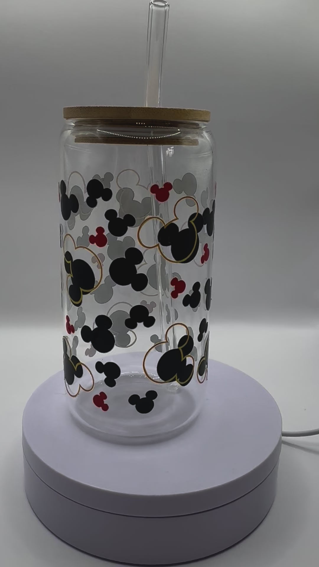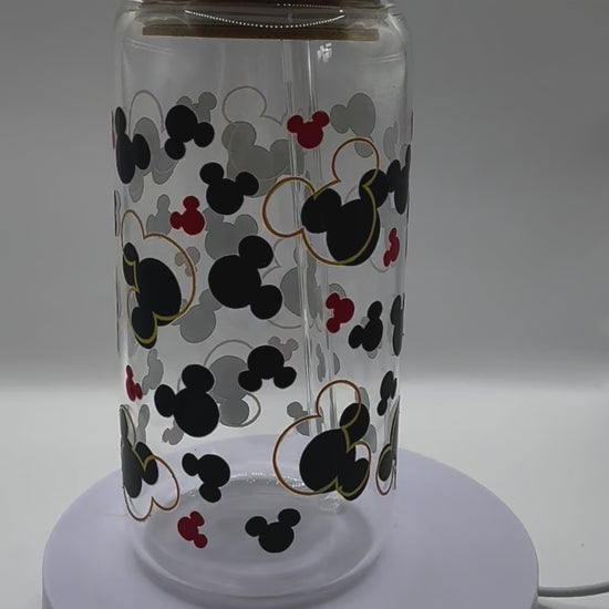 This 16oz glass cup features a fun Black, Red + Gold Mouse design. Hand wash only, avoid heat and do not soak or microwave for long-lasting enjoyment. A must-have for any glassware collection.