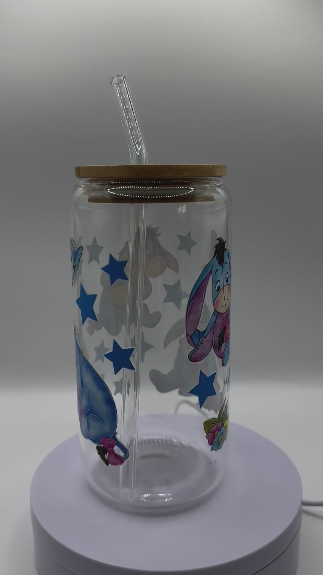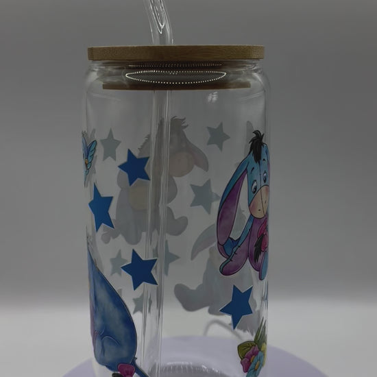 This 16oz glass cup features a playful Blue Donkey with Stars design. Hand wash only, do not put in the dishwasher or microwave, do not soak and avoid heat to keep its vibrant design intact. Perfect for daily use or special occasions. Enjoy your beverages in style with this unique cup.