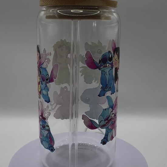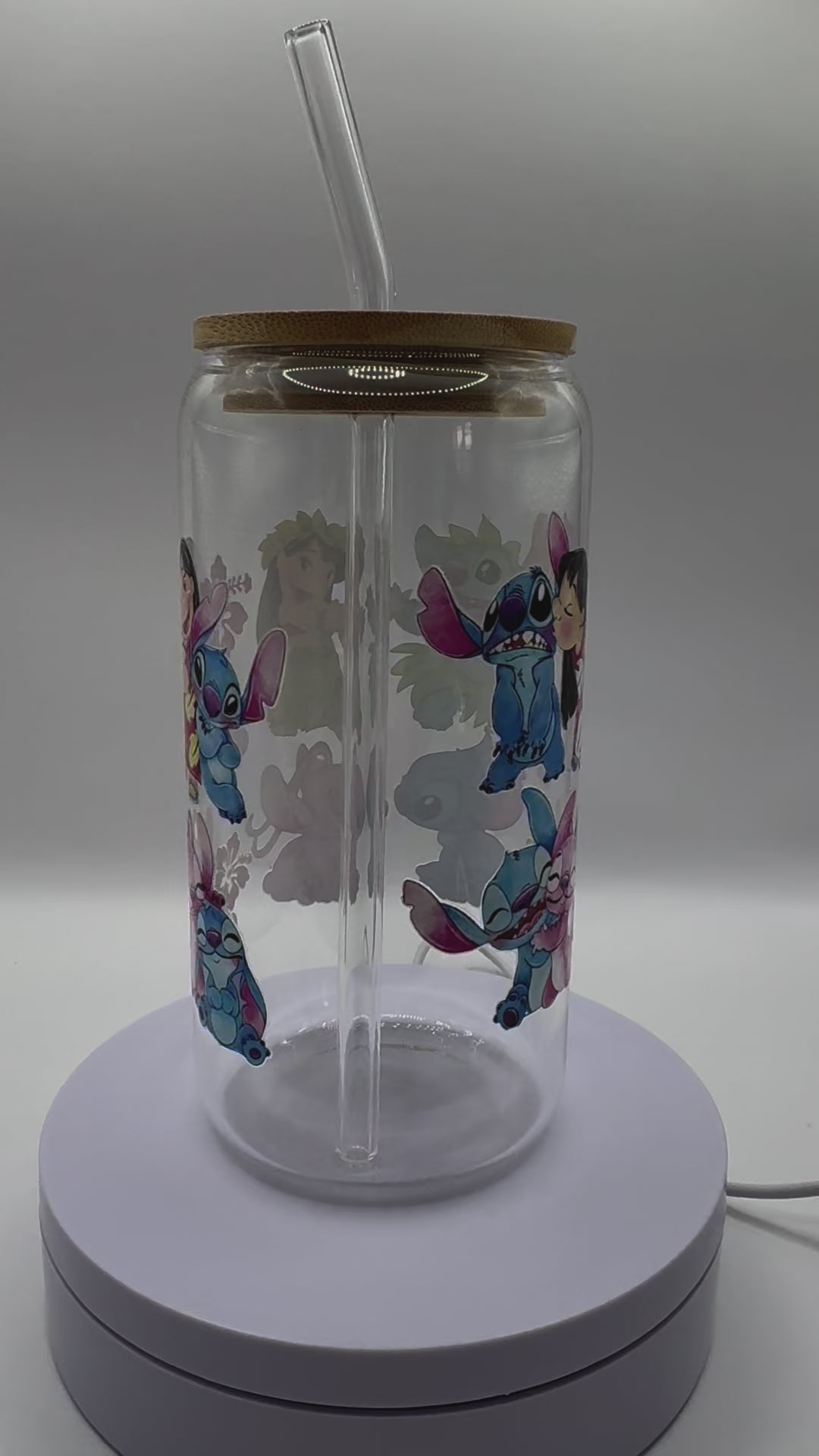 Introducing the Blue + Pink Aliens with Girl 16oz Glass Cup. With a 16oz capacity, this glass cup is perfect for your favorite beverages. This hand wash only cup is not dishwasher safe or microwaveable and should not be soaked in water or exposed to high heat.