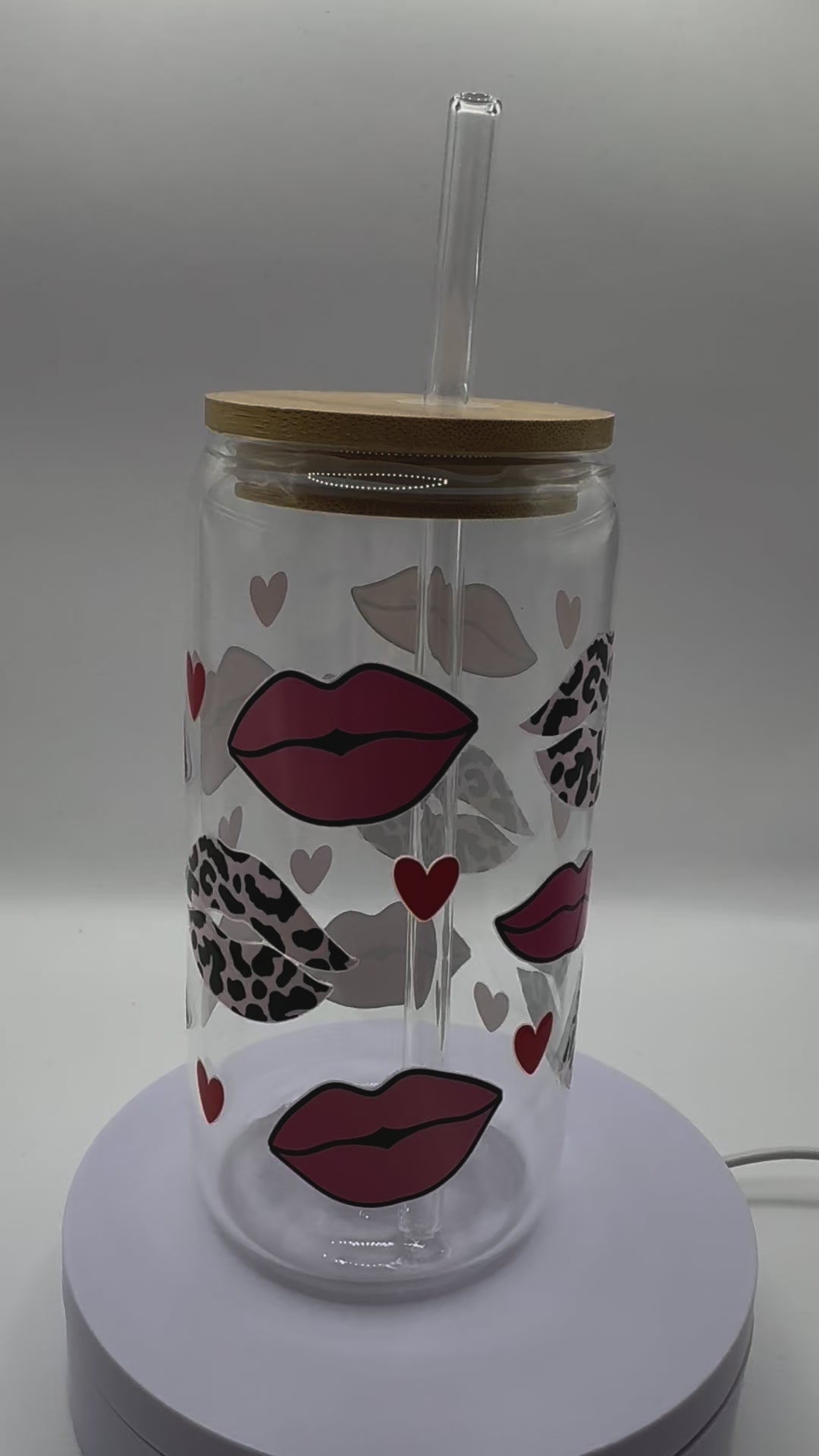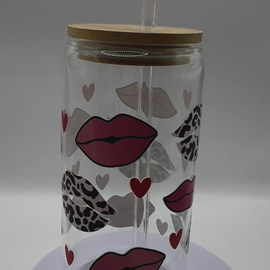Introducing the Lips + Love Hearts 16oz Glass Cup. With a 16oz capacity, this glass cup is perfect for your favorite beverages. This hand wash only cup is not dishwasher safe or microwaveable and should not be soaked in water or exposed to high heat.