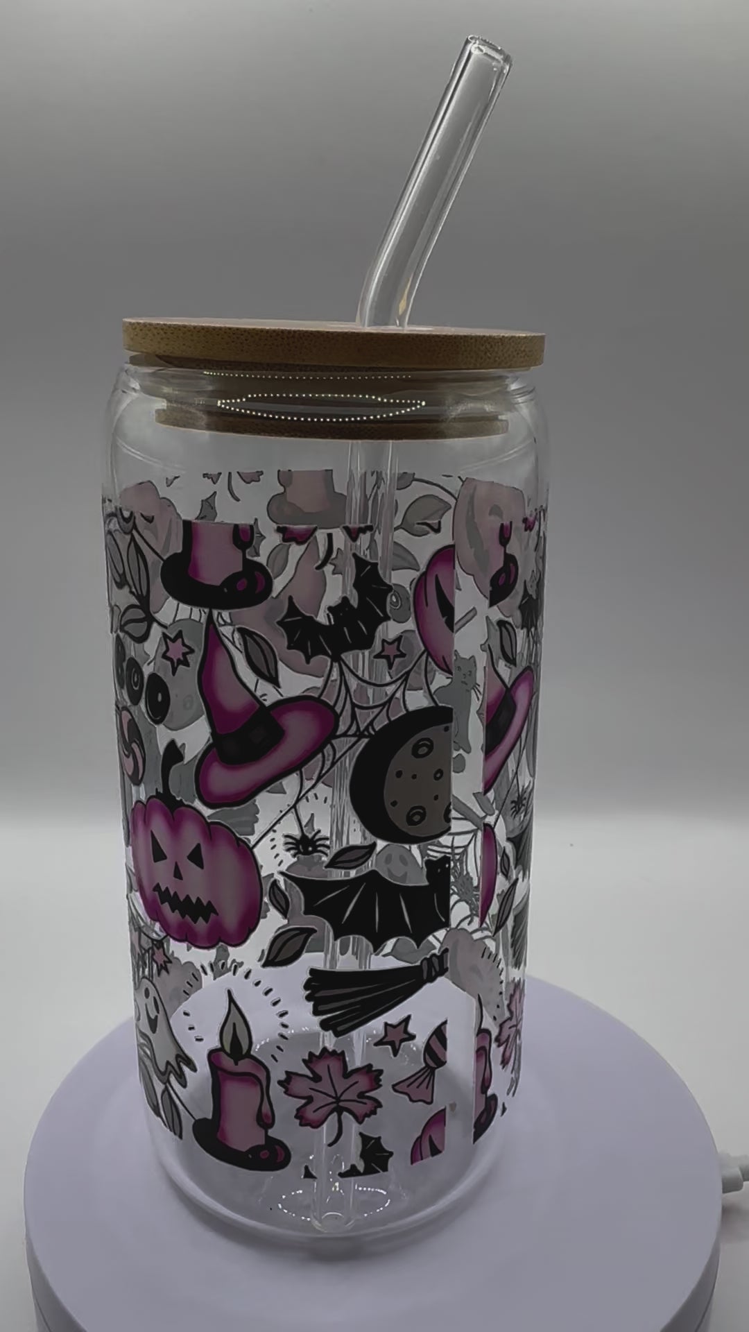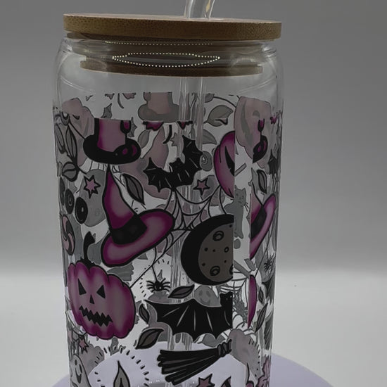 This 16oz glass cup features a fun Purple Pumpkins Halloween design. Hand wash only, avoid heat and do not soak or microwave for long-lasting enjoyment. A must-have for any glassware collection.