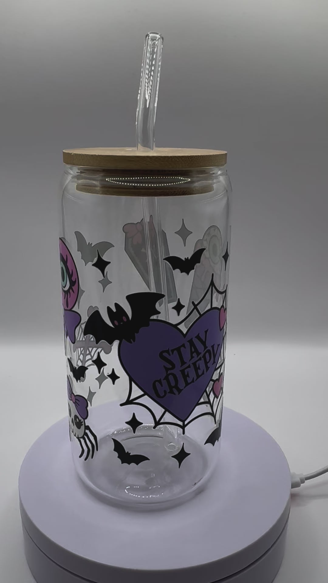 This 16oz glass cup features a fun Stay Creepy Halloween design. Hand wash only, avoid heat and do not soak or microwave for long-lasting enjoyment. A must-have for any glassware collection.